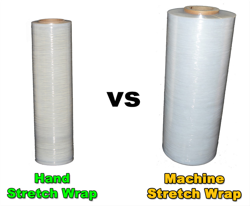 Each type of film uses different additives during the extrusion process. The additives used with the melted resin pellets adjust the performance of the stretch wrap. Additives can increase UVI resistances, puncture resistance, stretch rate, and more. For this comparison we are using hand and machine stretch wrap side-by side to display the stretch rate differences.