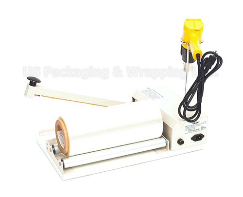 After the seal is made, the heat gun is used to apply heat to the film. The heat shrinks the film conforming it to the product being wrapped. The heat gun and sealer each require a 110v power supply.