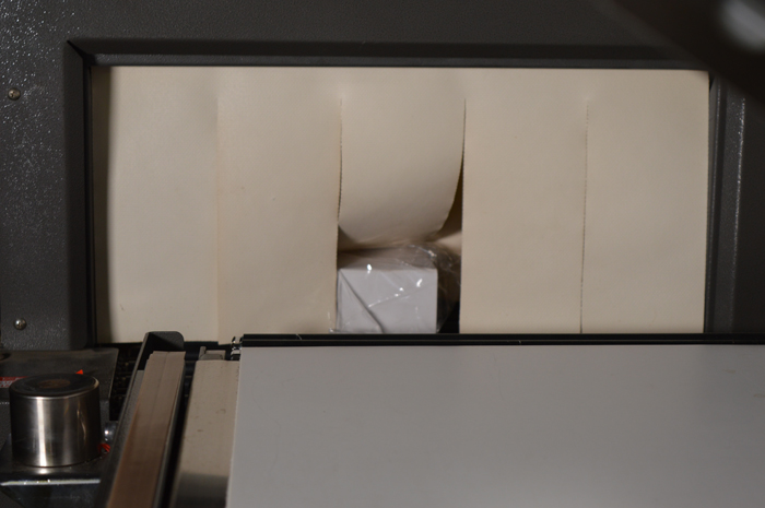 Taller products are typically easier to shrink package than shorter products or cubed products. For a square product, making a seal in the middle of the product height will make a big difference in the finished look of the packages. As the material shrinks, the seal will not be distorted or pulled to one side of the package.