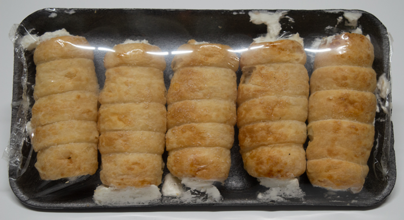Baked goods in frozen storage often have an uncooked product. The items are pulled out of the packaging and placed in the oven. Frozen pizzas have a cardboard round with a polyolefin shrink wrap. Other frozen rolls or bread may be in aluminum pans with a wrap over them for freezer storage. The tin helps to provide an additional oxygen barrier and a convenient way to heat the product.