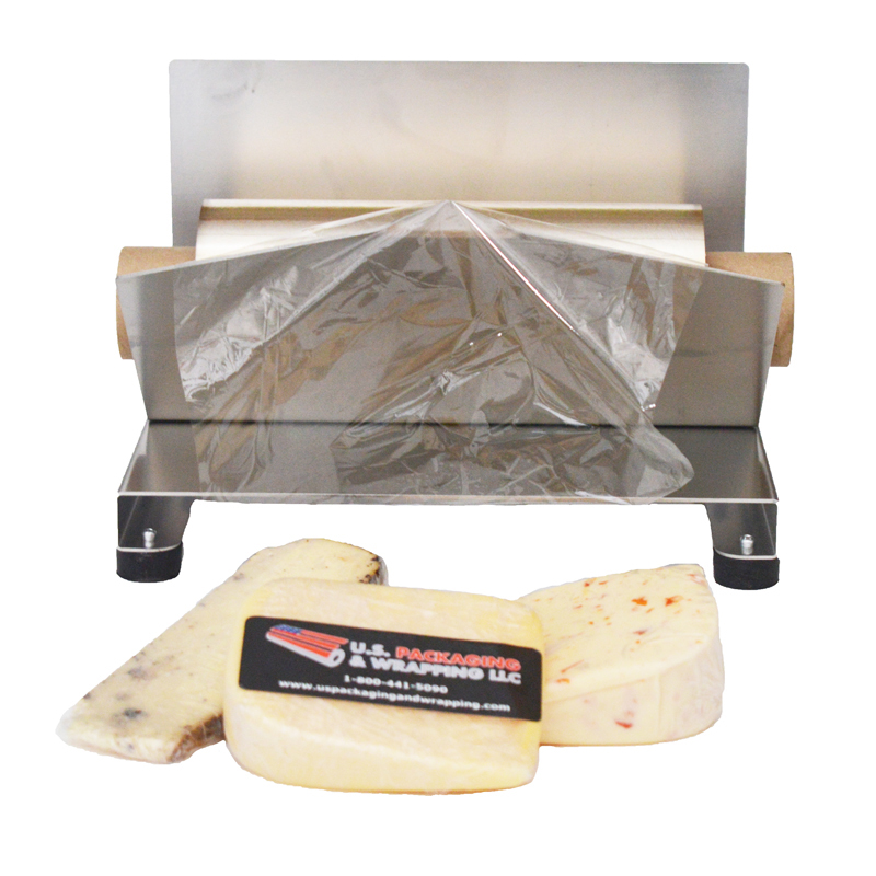 U.S. Packaging & Wrapping sells two types of dispensers for the cheese film sheets. The first is the perforated wrap dispenser, a durable stainless steel dispenser with a pointed edge for quickly tearing pre-cut sheets.